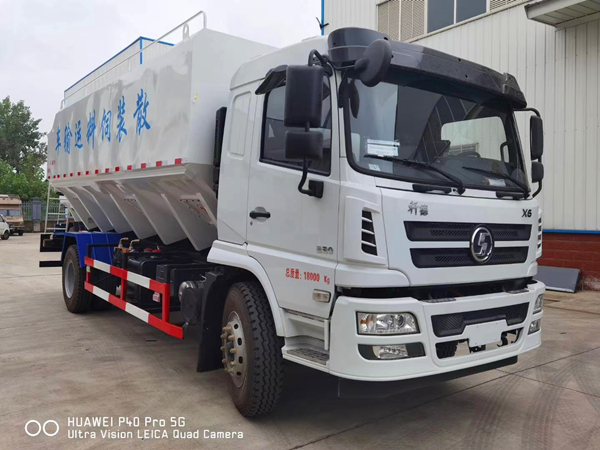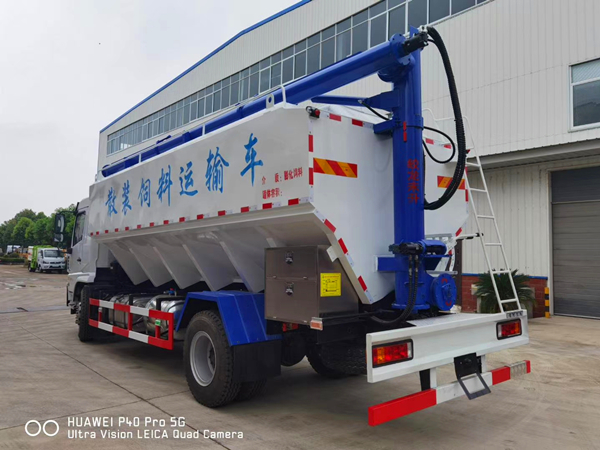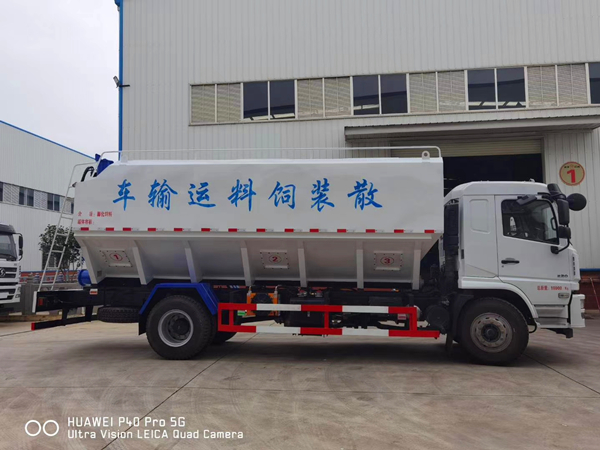 液壓式散裝飼料車的飼料罐架設在卡車的底盤上,專用設施由罐體總成、輸送系統(水平卸料系統、垂直卸料系統以及活動卸料系統組成)、液壓系統(高壓油泵經管路與分配閥連接該閥的三個輸出端分別是轉角液壓馬達、升降油缸以及串聯在一起的水平卸料、垂直卸料、活動卸料液壓馬達)、電動系統、氣動分倉機構等組成。在罐體底部設有閘門,在閘門下面裝有水平螺旋輸送器(俗稱水平攪籠),由取力器由汽車變速箱輸出動力驅動,再傳動高壓油泵以驅動液壓系統,液壓馬達通過傳動裝置帶動水平螺旋輸送器的葉片軸及葉片旋轉, 經活動輸送系統(俗稱活動攪籠)以將飼料輸出。車頂平置的一根活動卸料絞龍可自由回轉和抬升,運輸時,頂部的螺旋管平臥在罐頂;卸料時則抬起,使管端的出料口與畜禽飼養場貯料罐頂部的進料門相接、對準,完成卸料。電動絞龍散裝飼料運輸車是針對不同客戶群最新研發的、滿足低端市場的新產品,該車不配車載發電機,電動絞龍利用市電三相380V來供電,車輪距較小能適應農村鄉間道路。該車性價比高很受客戶的青睞,適用于路況狹小的小型養殖場、飼料廠。采用機械螺旋的卸料方式,卸料速度快,可連續作業,大大提高生產效率。罐體可分隔成二至四倉,同時裝載不同飼料;各部件結構簡單,操作方便靈活,易于維修保養。