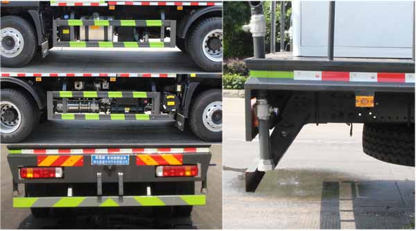 該車用途為抑塵降霾.主要裝置為罐體及噴霧裝置.罐體總容量:10.55立方米,罐體有效容積:10立方米,罐體外形尺寸(×長軸×短軸)(mm):2800×2450×1720.ABS控制器型號為CM4XL-4S/4M,ABS控制器生產企業為廣州瑞立科密汽車電子股份有限公司.側、后防護材料均為:Q235碳鋼,連接方式均為:螺栓連接,后部防護截面尺寸(mm):120×50,后部防護離地高度(mm):470.僅采用底盤3950mm軸距改裝.選裝前部電子炮樣式;選裝前部不帶電子炮.當前部選裝不帶電子炮時,車長7780mm,無前伸.當前部選裝帶電子炮時,車長8280mm,前伸為500mm.隨底盤選裝新前圍及LOGO.選裝前面板"福田·領航"裝飾字樣.