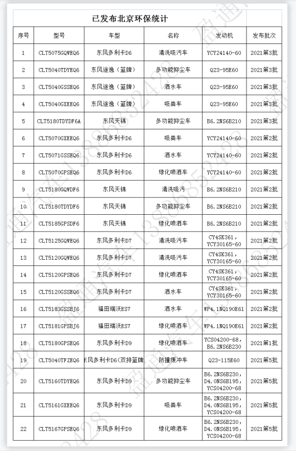 | 22 | CLT5167GPSEQ6 | 東風(fēng)多利卡D9 | 綠化噴灑車 | B6.2NS6B230,D4.0NS6B195,YCS04200-68 | 2021第5批 |