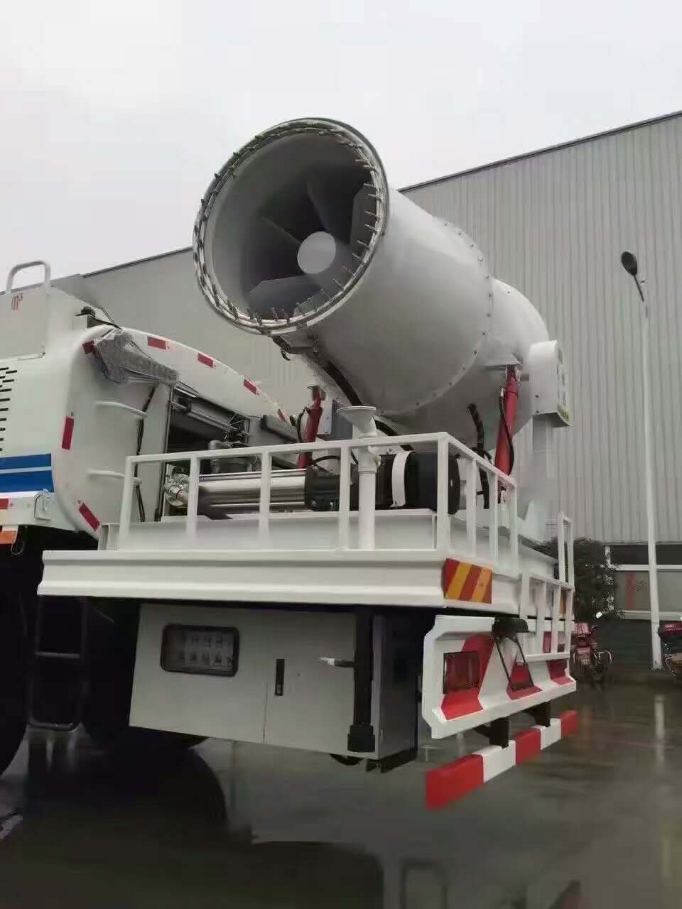 上裝采用武漢碳鋼板定制8噸水罐,配備杭州威龍灑水泵,帶前沖后灑,后置工作平臺,配備山東北華80型風機,帶柴油發(fā)電機組。最大霧化可達80米。降塵首選。
