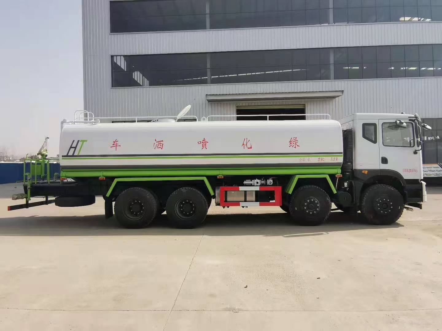 整車型號:HTX5316GPSL6型綠化噴灑車,浩天星運牌,底盤型號EQ1310GL6DJ ,發動機為玉柴270馬力(YCS06270-60)國六排放標準,軸距1850+3200+1350mm,華神T5駕駛室,陜齒大八檔變速箱(SC-8JS118TC-B)帶法蘭式取力器,5t雙前橋/10t后橋,11.00R20鋼絲胎,車架280mm,空調,氣囊座椅,中控,多功能方向盤,行駛記錄儀。上裝:罐體采用標準Q235碳鋼制作,罐體自動焊,裝水25噸,配大功率專用灑水車,可自吸自排,前沖后灑,側噴,高位花灑,主管道加粗,大通徑球閥,直通球閥式消防接口,帶后工作平臺,沖孔平臺,帶高炮。(可選裝大平臺,可裝30米霧炮降塵)。