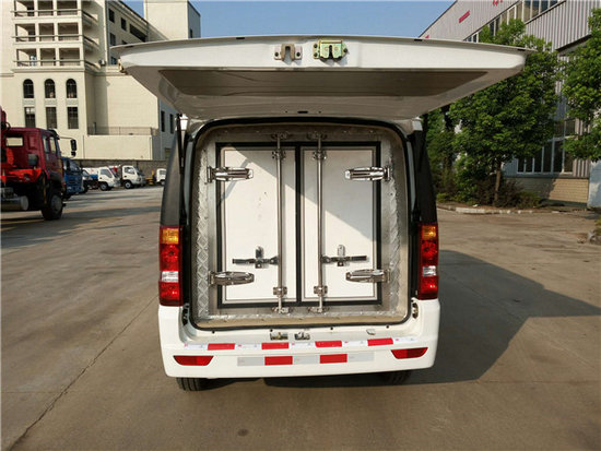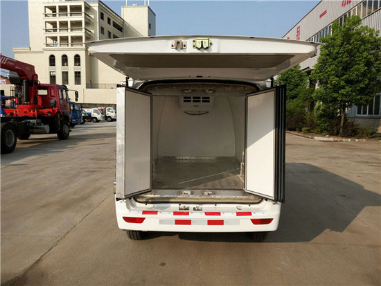冷藏車廂體:采用國標A級聚氨酯保溫材料,厚度為8厘米,廂體內外采用玻璃鋼材質全包裹。不銹鋼鎖件。包角、包邊鋁合金型材。底盤采用高強度花紋鋁板定制。可選裝肉鉤導軌,和底部通風槽