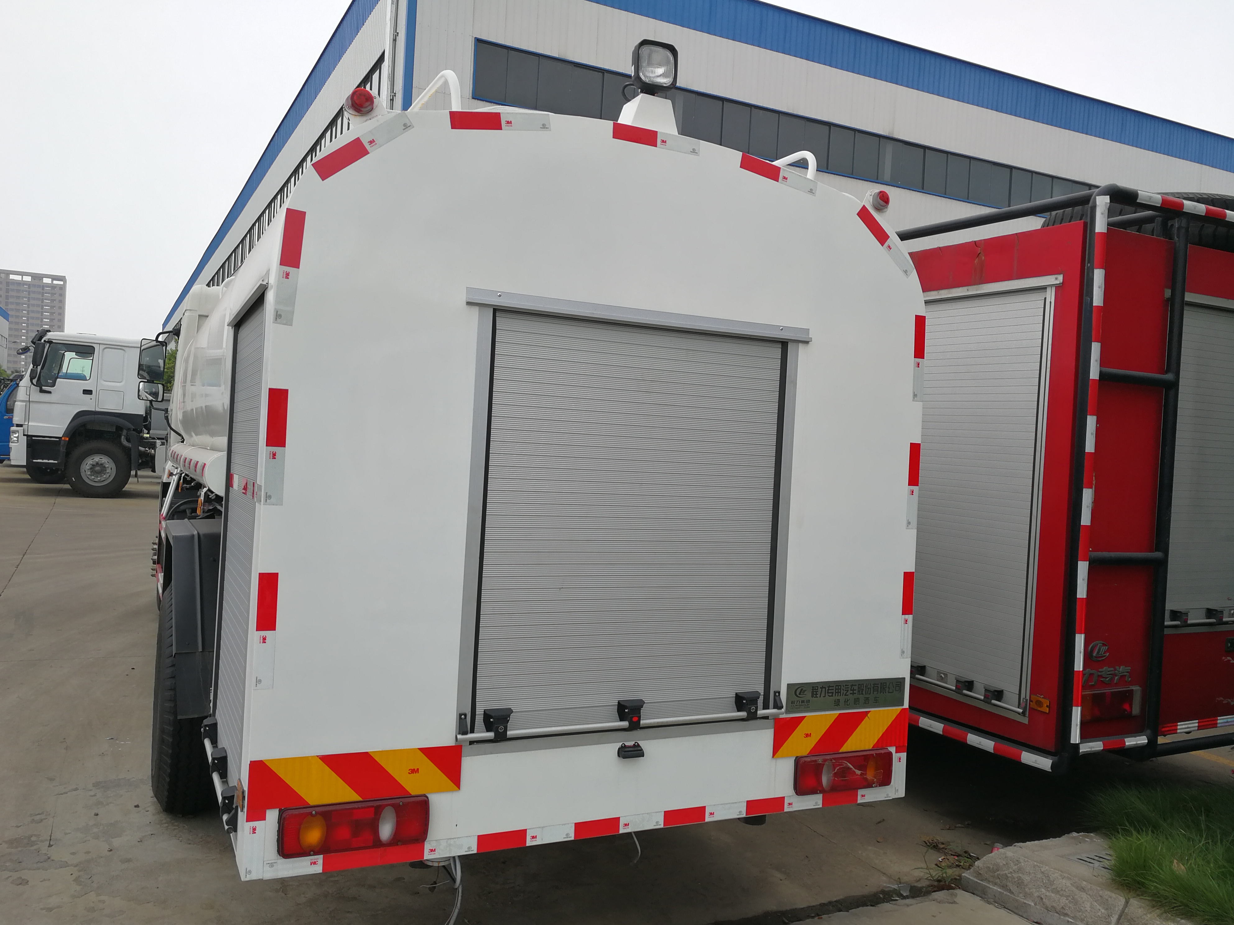該車主要用于城鄉(xiāng)園林綠化噴灑;主要裝置為罐體及噴灑裝置;隨底盤選裝駕駛室,罐體總?cè)萘?/span>:11立方米;罐體有效容積:10.9立方米;罐體外形尺寸(×長軸×短軸)(mm):3700×2400×1540;ABS控制器型號(hào)為CM4XL-4S/4M,ABS控制器生產(chǎn)企業(yè)為廣州瑞立科密汽車電子股份有限公司;側(cè)、后防護(hù)材料均為:Q235碳鋼,連接方式均為:螺栓連接,后部防護(hù)截面尺寸(mm):120×50,后部防護(hù)離地高度(mm):450.采用3950mm軸距.選裝電瓶,油箱出口位置,選裝擋泥板樣式。選裝側(cè)部及后部樣式時(shí),后部防護(hù)為專用裝置代替,離地高度為450mm