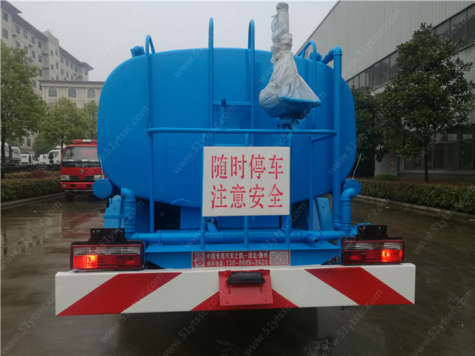 6、灑水車前噴頭位置較低,靠近地面,噴灑壓力較大,可用于沖洗路面;后噴頭位置較高(灑水車后噴頭一般左右各安裝一個),灑水面較寬,可用于公路施工灑水,使用后噴頭時,應將前噴管關閉;使用可調噴頭灑水時,灑水寬度可根據需要調整。灑水寬度越寬,中間重疊量越少,灑水密度越均勻。
